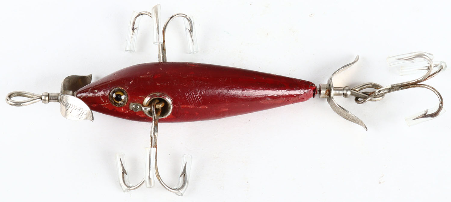 Heddon 100 DOWAGIAC MINNOW, 3 hook lure, red finish, has glass eyes, paint has shows light surface wear but no chipping, L-Rig. Grade: Excellent - Value: 50 to 200