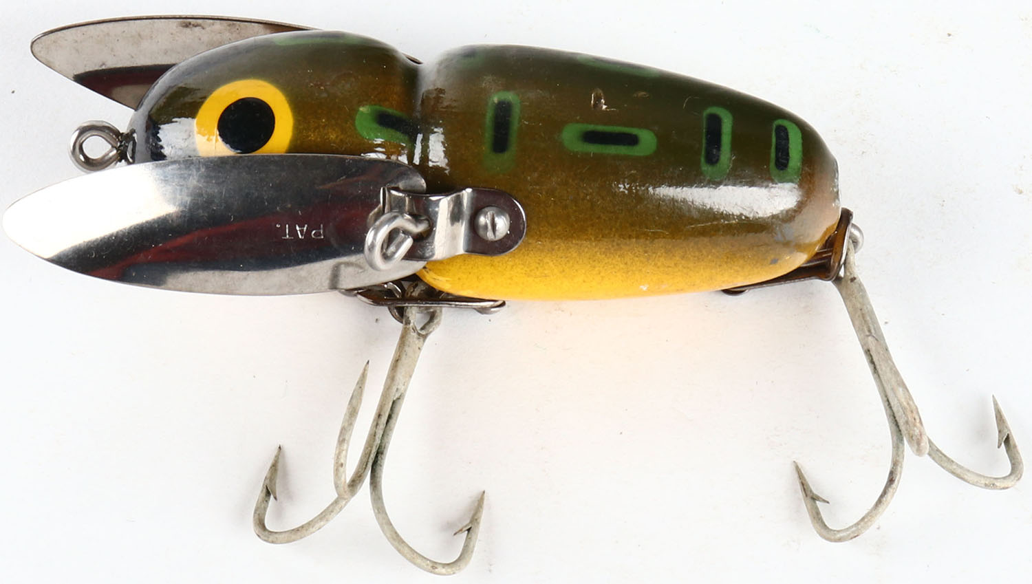 Heddon Crazy Crawler, wood lure, PE, frog pattern, 2 hooks, surface rig, 3''. Grade: Excellent ++ - Value: 20 to 80