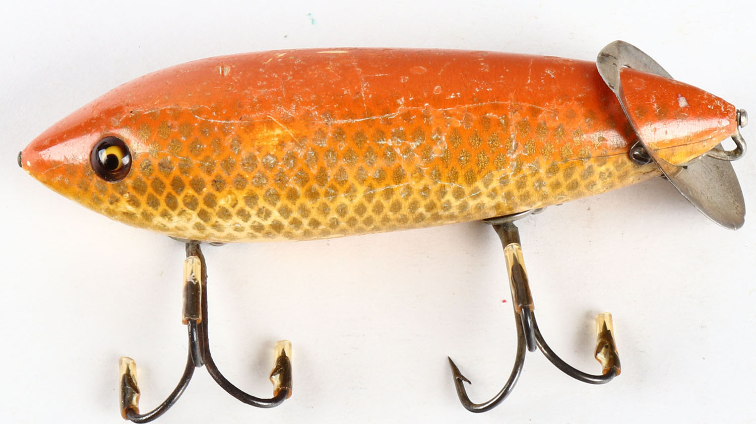 Heddon Crab Wiggler, wood lure, GE, Gold Fish color, (orange with gold scale), 2 hooks, marked metal lip, 1 line tie, L-rig, 4'', some surface wear. Grade: Very Good ++ - Value: 20 to 60