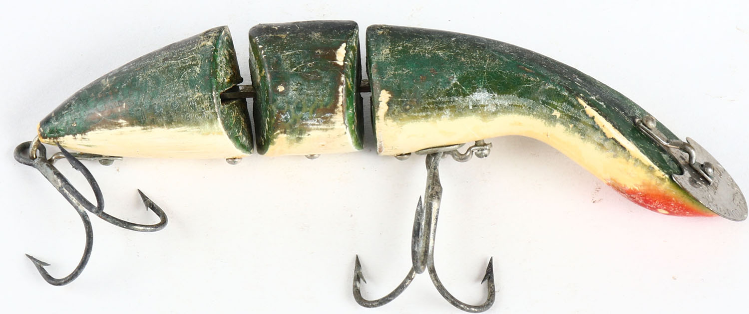 Heddon Game Fisher jointed lure, wood lure, no eyes, Green with white belly, 3 hooks, marked metal lip, L-rig, 5'', possible repaint. Grade: Very Good + - Value: 10 to 50