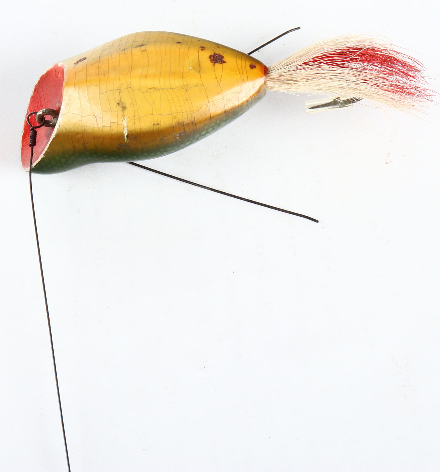 Heddon Weedless Widow, wood lure, no eyes, Green Scale, 1 hook, unmarked belly, 3 3/4'', red & white hair skirt, near mint. Grade: Excellent ++ - Value: 20 to 80