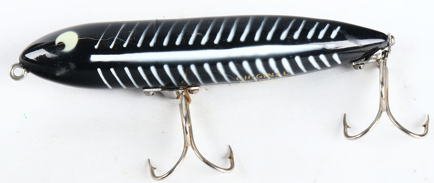 Heddon ZARA Spook, wood lure, PE, black skeleton, 2 hooks, marked belly, surface rig, 4 1/2'', near mint. Grade: Excellent ++ - Value: 10 to 50