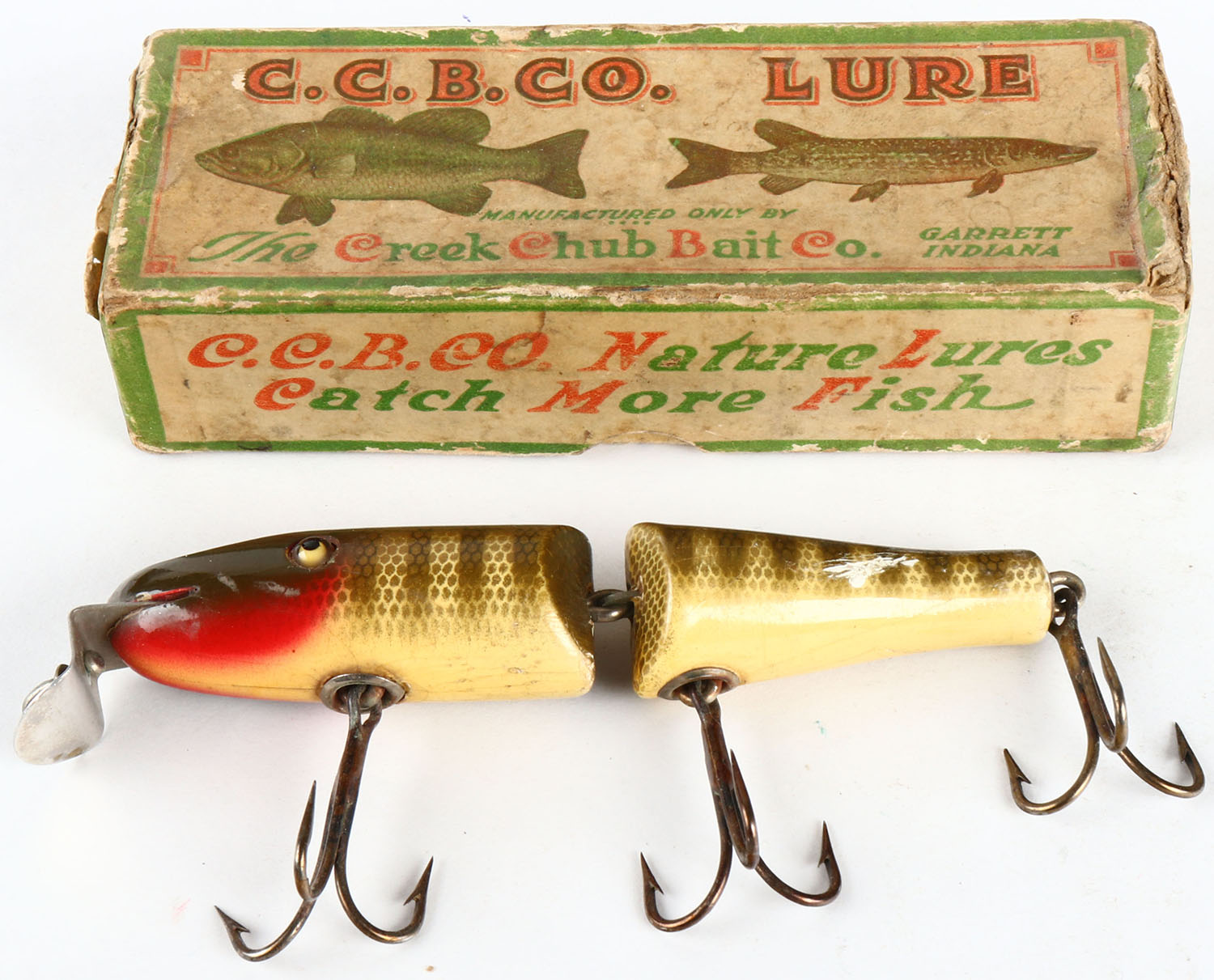 Creek Chub Jointed Pikie in original box, wood lure, GE, Pikie finish, 3 hooks, marked belly, Cup rig, 5'', has one scuff mark, box shows age soiling. Grade: Very Good ++ - Value: 10 to 30