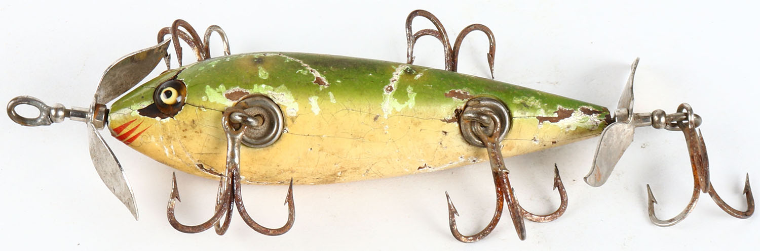 Pflueger Monarch Underwater wood lure, GE, frog pattern, 5 hooks, marked metal spinners, Neverfail hdw, 5'', shows scuffing & hook dings. Grade: Very Good - Value: 30 to 150