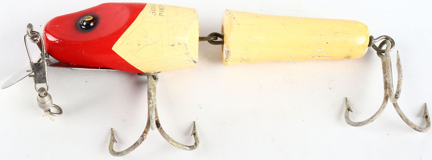 South Bend Jointed Pike Oreno, TE, red & white, well marked on back, 6'', shows light crazing with some paint loss to tip of eyes, still a nice wood lure, 2 hooks. Grade: Excellent - Value: 20 to 60