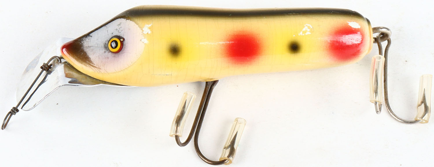 South Bend Pike-Oreno wood lure, Strawberry finish, TE, 2 hooks, 3 3/4'', cup rig. Grade: Excellent + - Value: 10 to 50