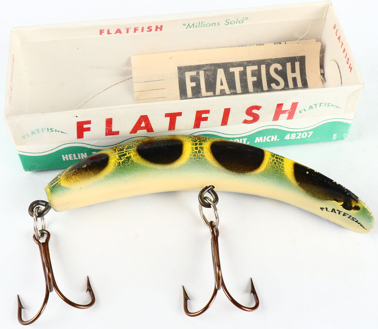 | Large Flat Fish lure in the original box, No. T60, frog pattern,...