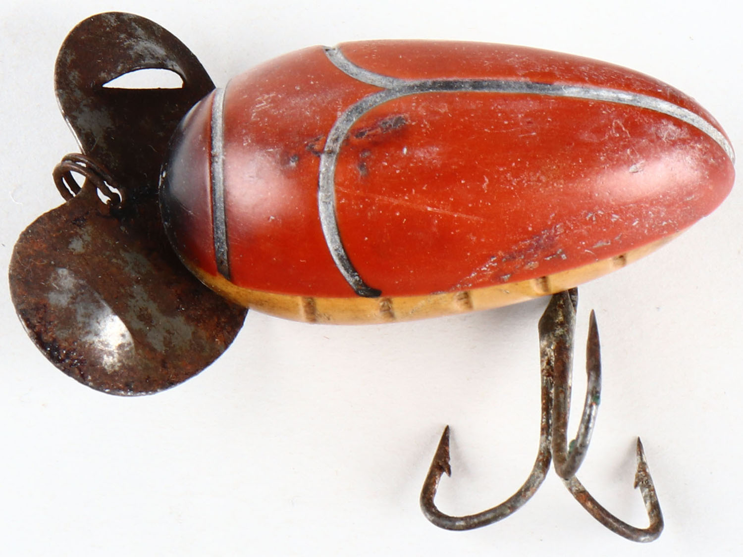 Millsite Paddle Bug lure, red & white, no eyes, rusted front metal lip, 1 hook. Grade: Very Good - Value: 2 to 20