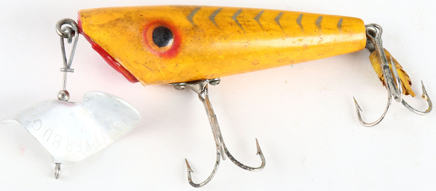 Fred Arbogast Sputter Bug lure, yellow with silver lines, PE, 2 hooks. Grade: Excellent - Value: 6 to 30