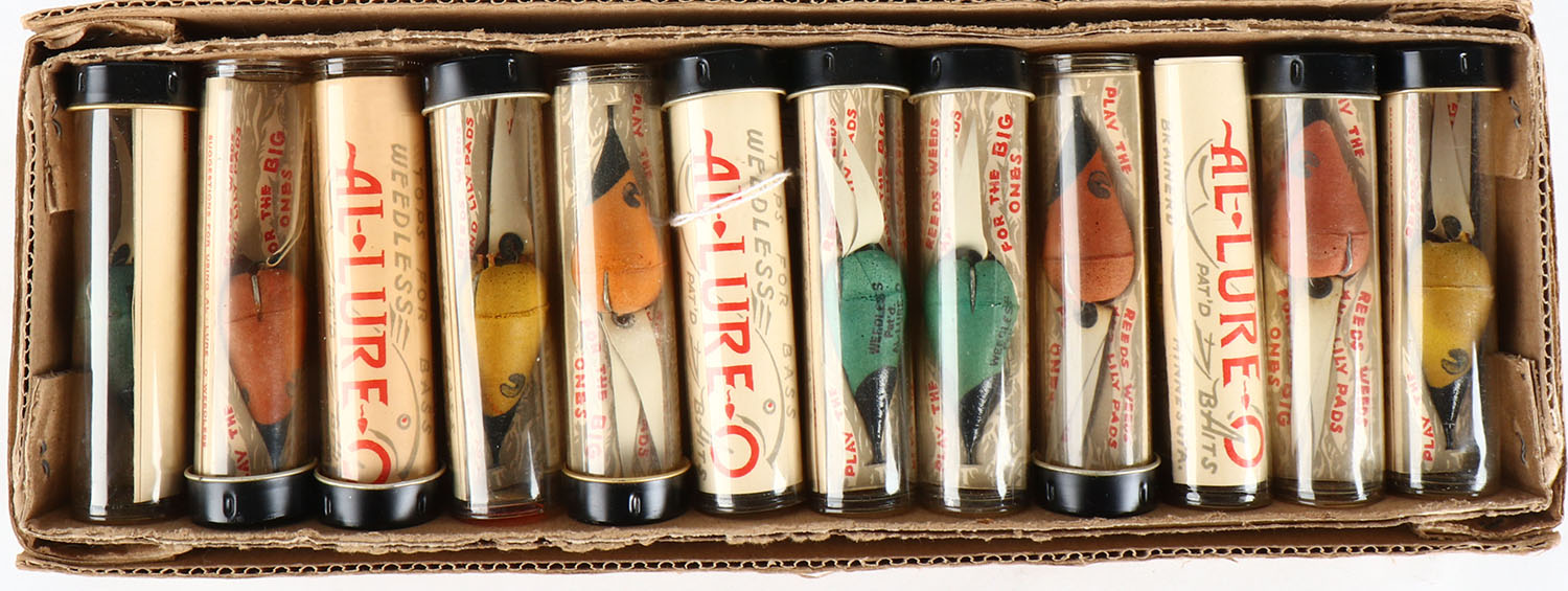 Full Case of Weedless AL-LURE-O mouse lures in original tubes, many different colors, 12 total. Grade: Excellent ++ - Value: 20 to 100