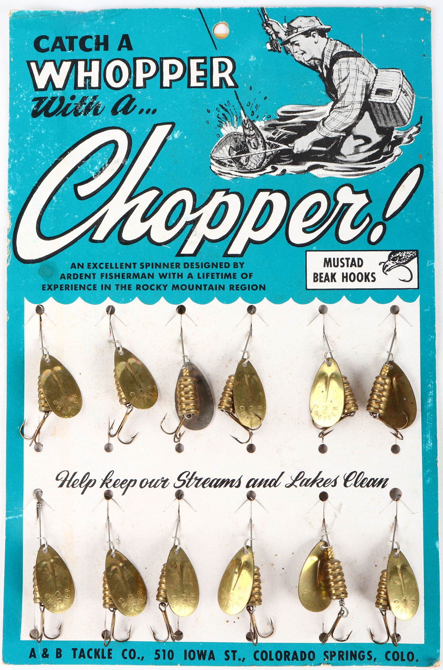 FULL CARD of A&B Tackle Co CHOPPER spinners, 12 are on the card, 7'' x 11''. Grade: Excellent + - Value: 10 to 50