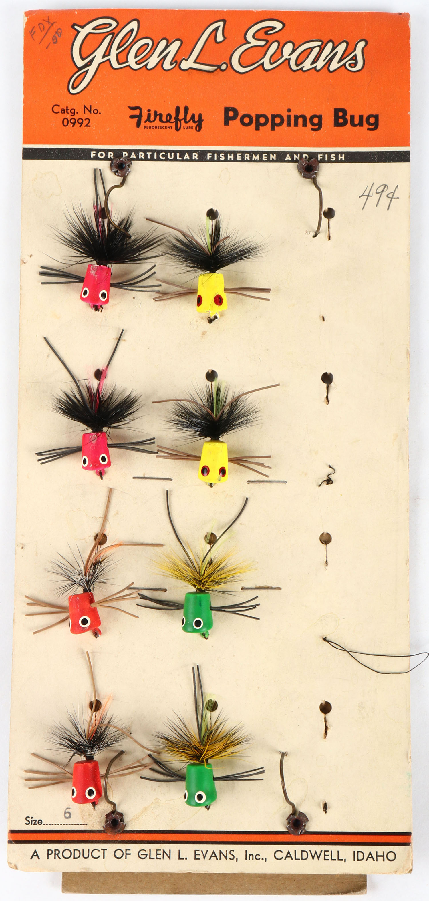 | Glen L Evens Inc. partial card of POPPING BUG lures, 8 out of 12...