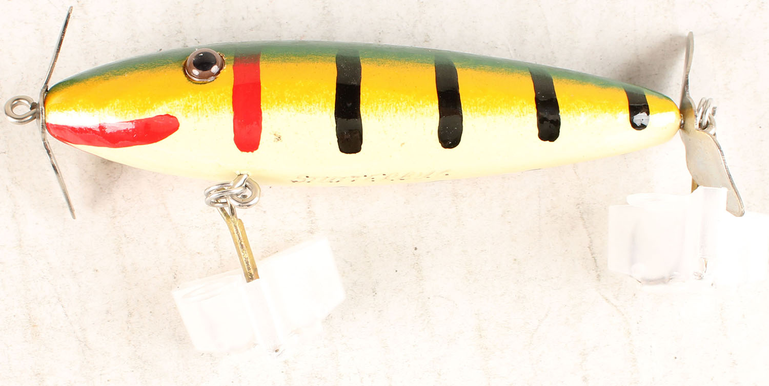 Meltillis Sputterbug lure, GE, green, orange & white with stripes. Grade: Excellent ++ - Value: 6 to 30