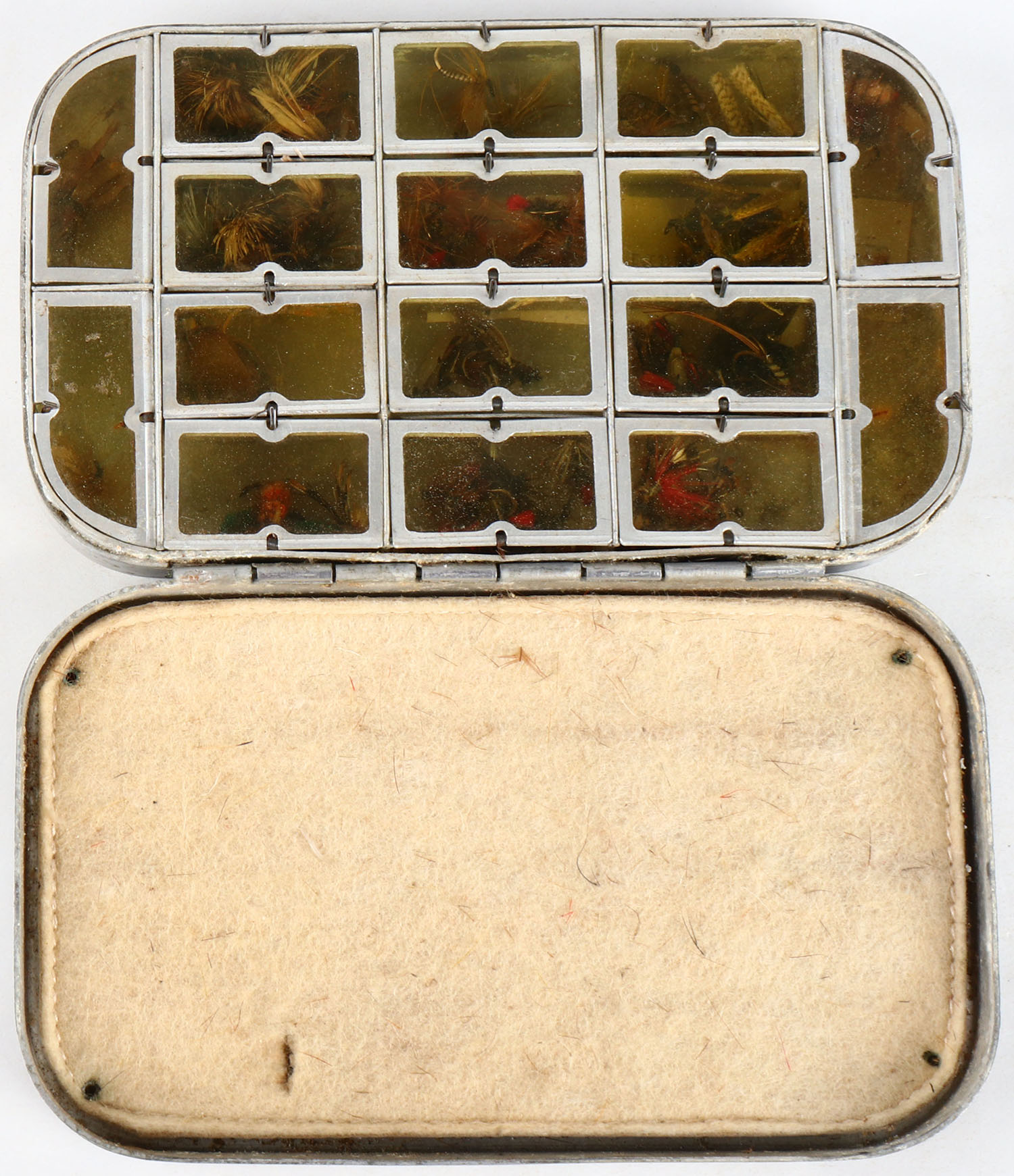Wheatley aluminum Fly wallet full of over 100 flies, 6'' wide. Grade: Excellent - Value: 10 to 50