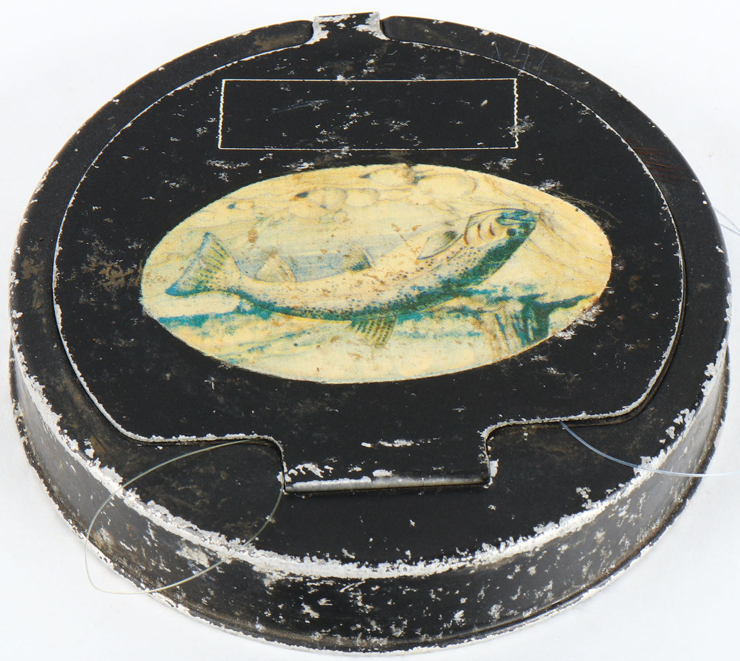 1920's Sunland MFG Fly Box with a Fish label on top, has a few flies inside. Grade: Very Good ++ - Value: 10 to 50