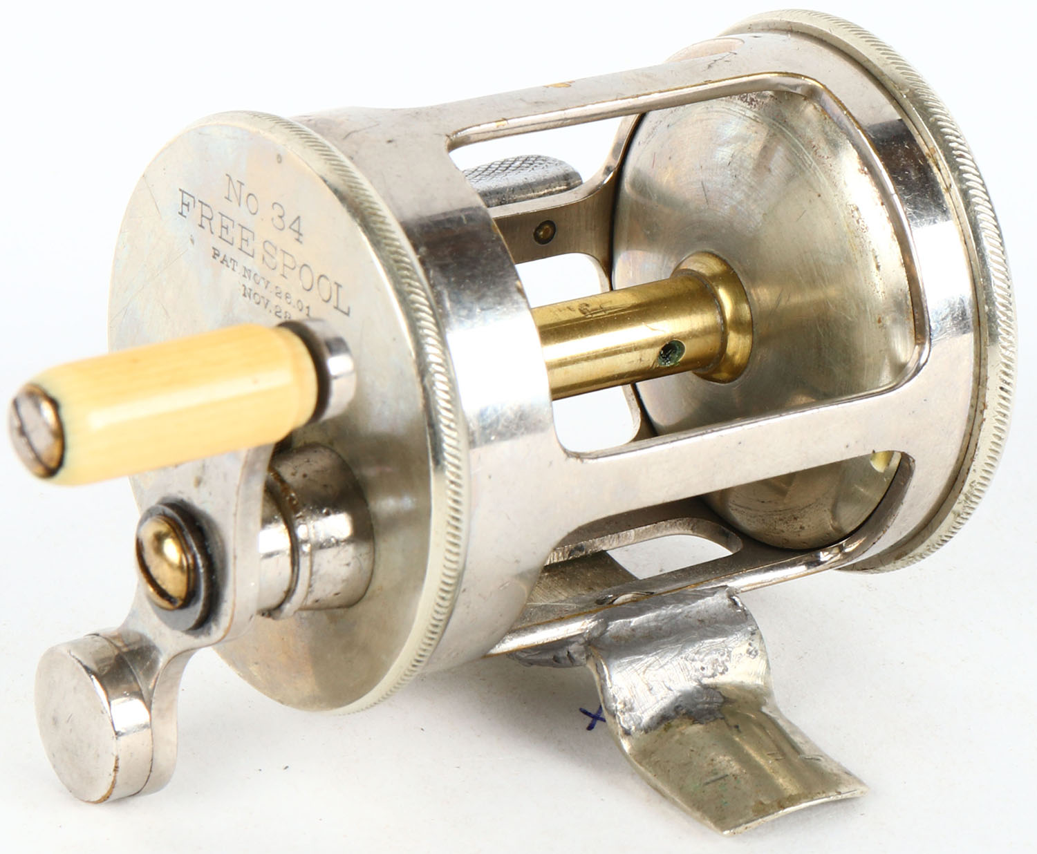 RARE B.F. MEEKS & Sons No 34 FREE SPOOL reel, Louisville, KY, very rare with the only flaw is the reel seat has been soldered, only made for 2 years. Grade: Very Good - Value: 150 to 1000