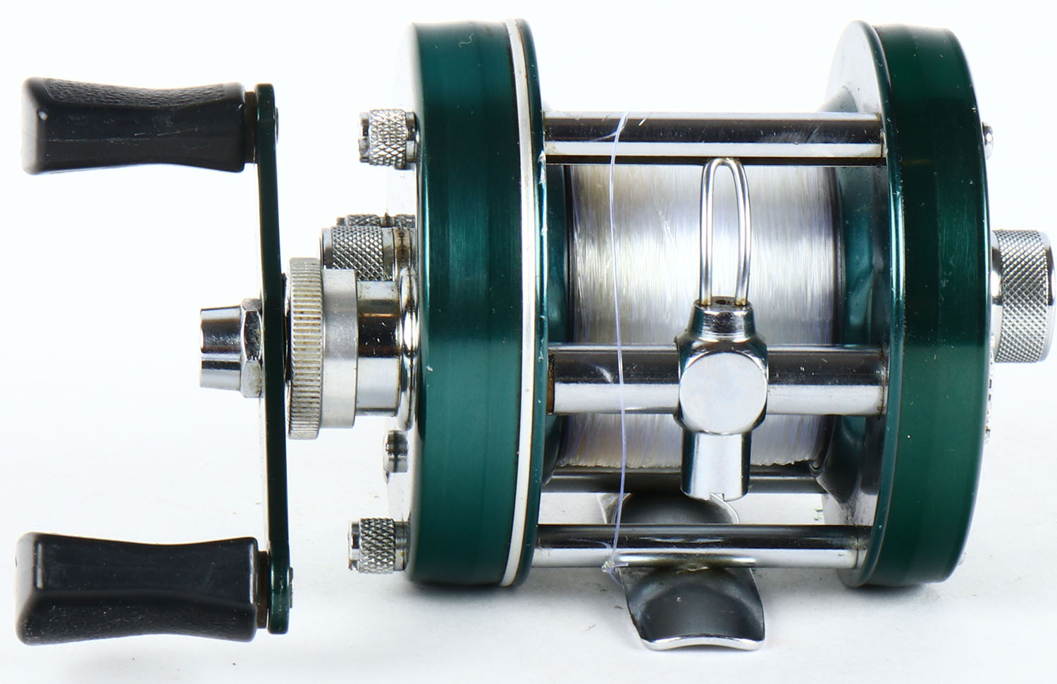 ABU Ambassadeur 5000 level wind reel, dual handle, ridge plates green, spins great & has strong click. Grade: Excellent ++ - Value: 30 to 100