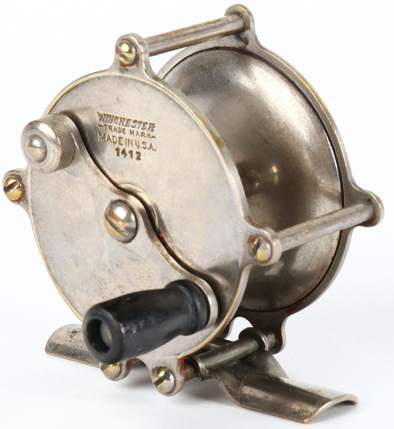 Winchester Fly Reel, No. 1412, 2 1/4'' dia, single wood handle, 80yds. Grade: Excellent - Value: 50 to 150