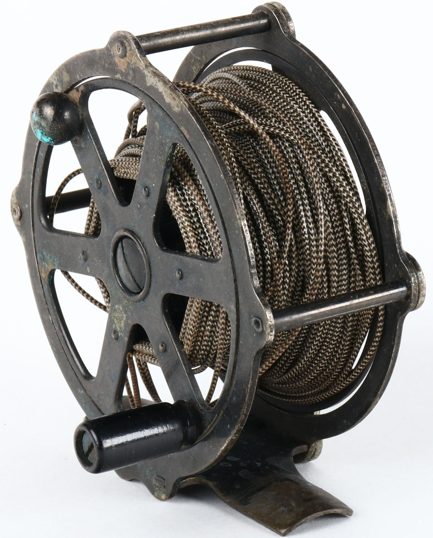Unmarked skeleton fly reel, 100yds, 2 5/8'' dia., works great. Grade: Very Good - Value: 6 to 30