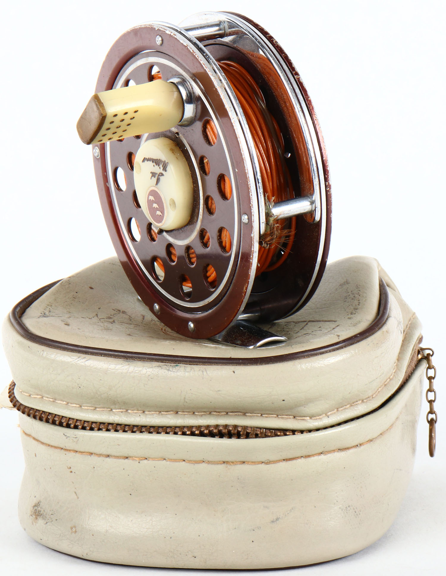 Sears & Roebuck, Ted Williams Fly Reel, Model 312-3140, has leather pouch with paperwork. Grade: Excellent - Value: 10 to 50