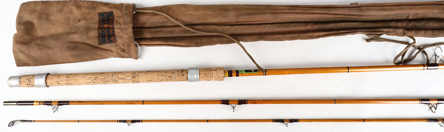 Allcock Cane Spinning Rod, Redditch, England, 11', 3/1, label on base of rod is excellent, cork handle is excellent, has marked cloth bag. Grade: Excellent - Value: 100 to 400