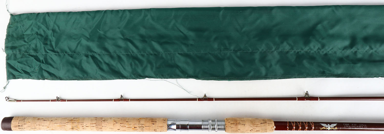 Fenwick spinning rod, FS89C, 8' 10'', 11 3/8oz, 1-2 1/2oz lures, 15-30 lb line, 3-8 oz mooch wt, 2/1. Grade: Excellent - Value: 10 to 60