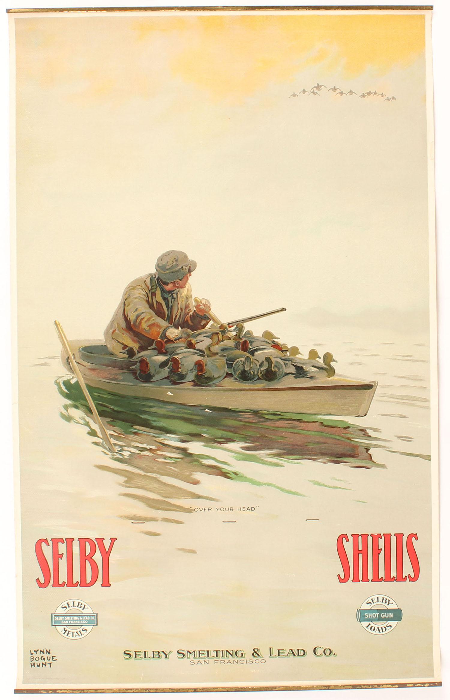 RARE 1912 SELBY Calendar, ''OVER YOUR HEAD'', artist Lynn Bogue Hunt, has great full color image of duck hunter in boat full of decoys with ducks setting in, has bands top & bottom with no hanger, no pages but staples are there, 100% all original, 16 1/4'' x 26 3/4'', has two very small scuffs to side of boat otherwise great colors, perfect edges & no wrinkles, first & best one we have ever seen! Grade: Excellent ++ - Value: 2000 to 4000