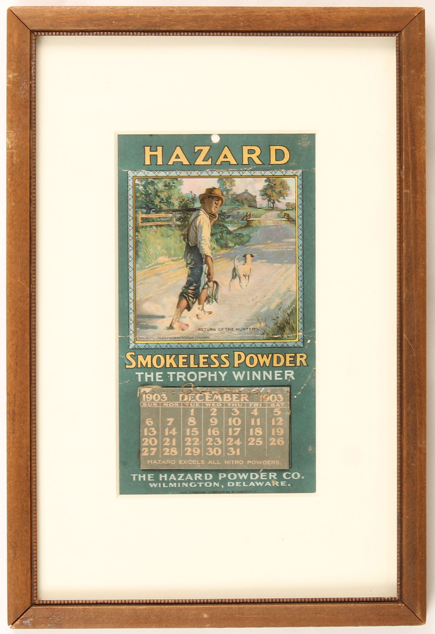 1903 Hazard Powder Co. Mini Calendar, ''Smokeless Powder The Trophy Winner'', full color image of young boy holding a squirrel & a 22 rifle with his dog, titled '' RETURN OF THE HUNTERS'', Dec. page, 3 1/2'' x 6 1/4'', has a few creases with nice colors, framed. Grade: Very Good ++ - Value: 100 to 400