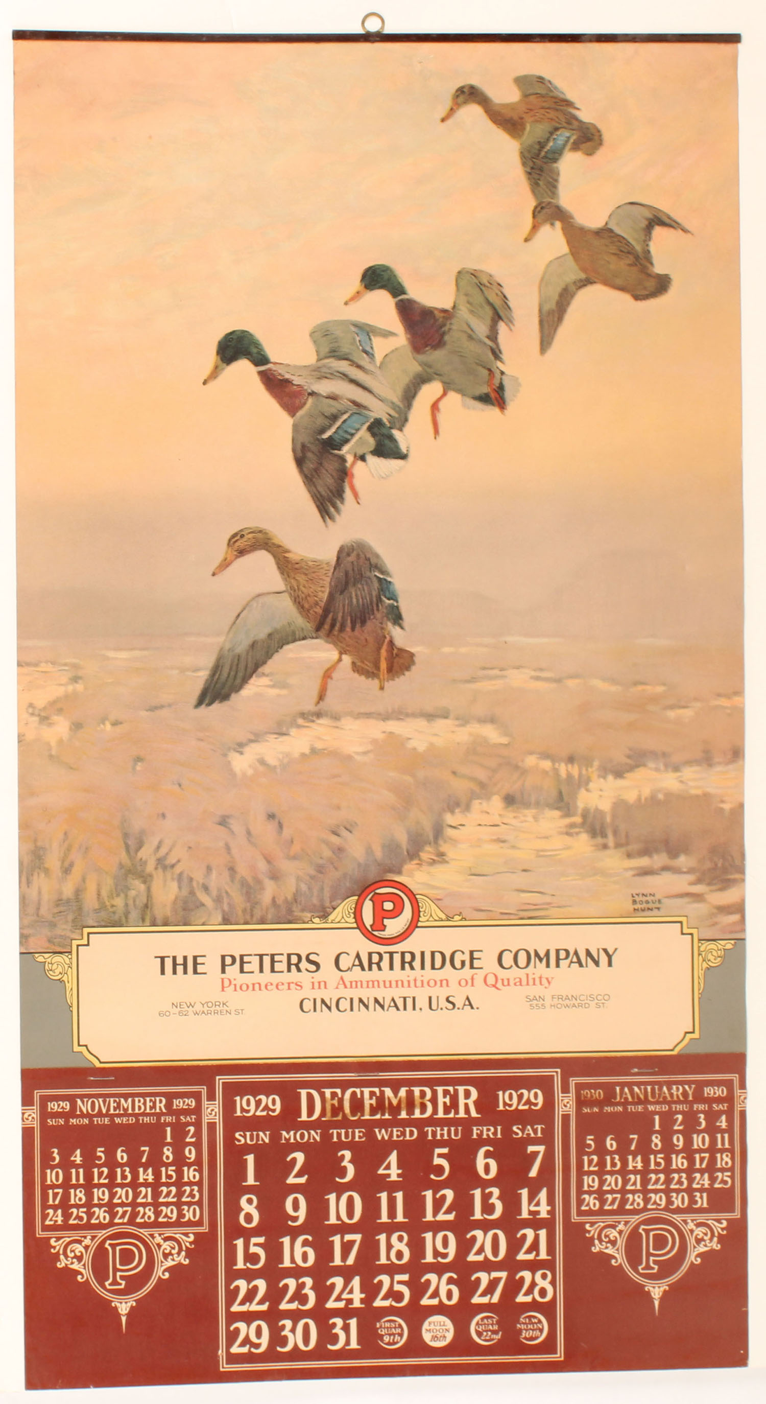 1929 Peters Calendar by Lynn Bogue Hunt, Pictures Mallards in flight, top band with brass hanger, 15'' x 27 3/4'', calendar is excellent with great colors, has small tear to top center just under band, all original condition, Dec page. Grade: Excellent - Value: 800 to 1600