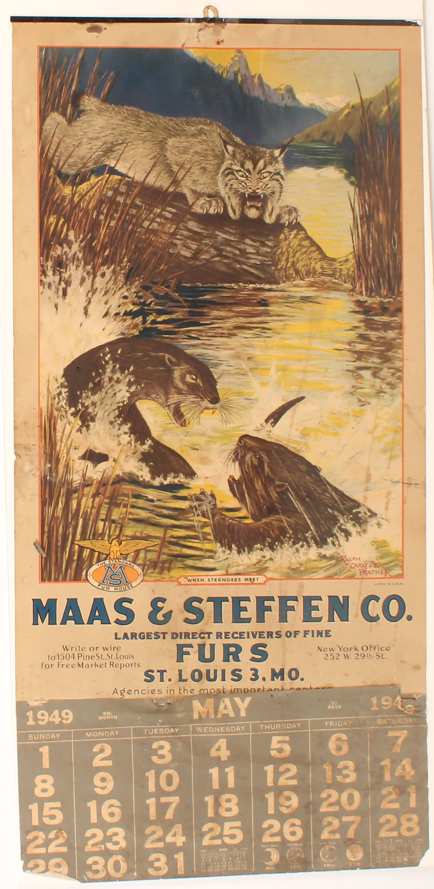 1949 Mass & Steffen Calendar, ''WHEN STRANGERS MEET'', pictures a beaver, muskrat & links at waters edge fishing, by Ralph Carlyle Prather, shows age soiling, otherwise nice, 13 1/4'' x 17 3/4'', has metal band & hanger on top, May page. Grade: Very Good - Value: 70 to 200