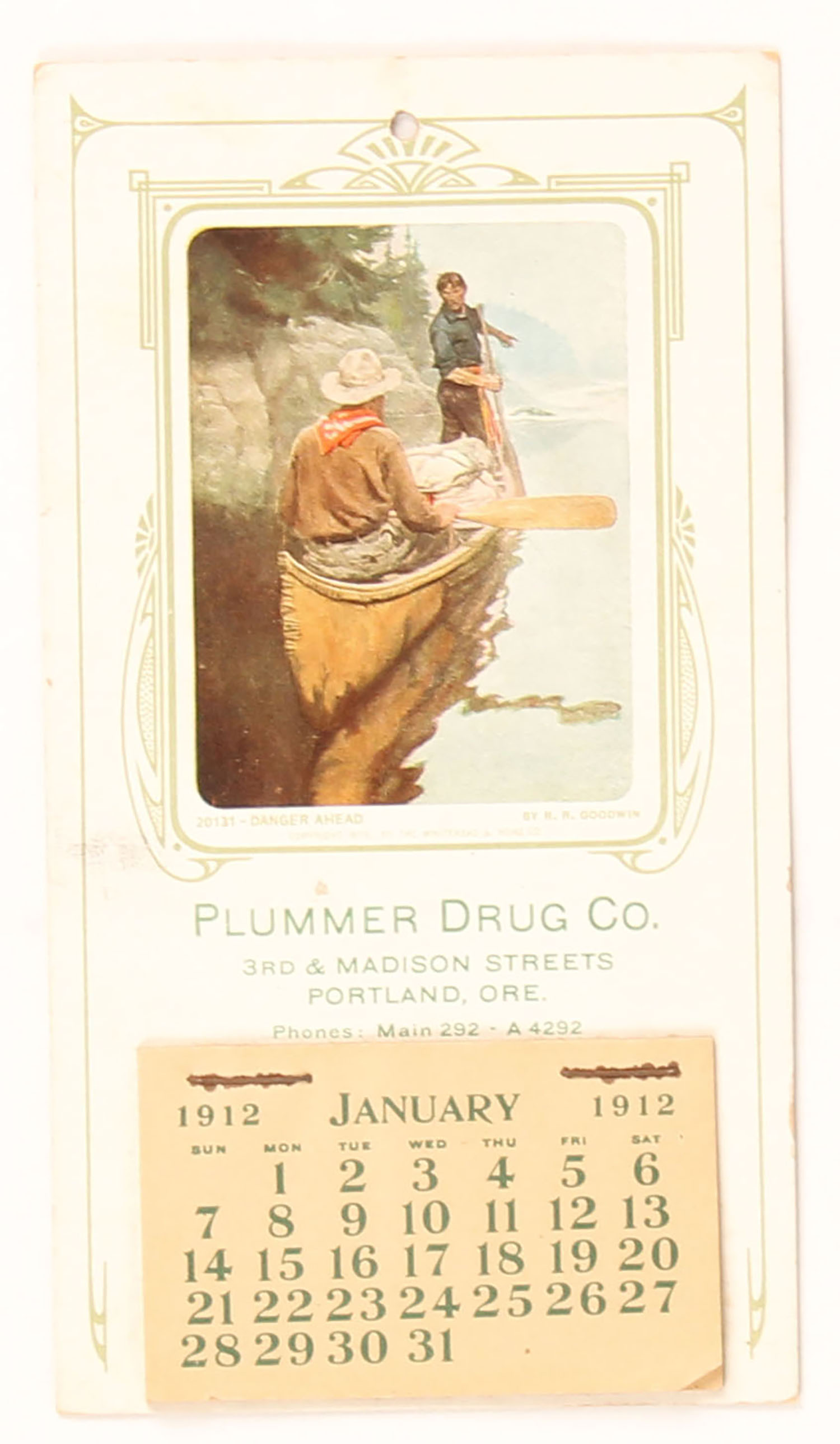 1912 Philip R Goodwin Mini Calendar, ''DANGER AHEAD'', pictures two guys in a birch canoe headed for a waterfall, full pad of pages, 3 3/8'' x 6 1/8''. Grade: Excellent - Value: 40 to 250