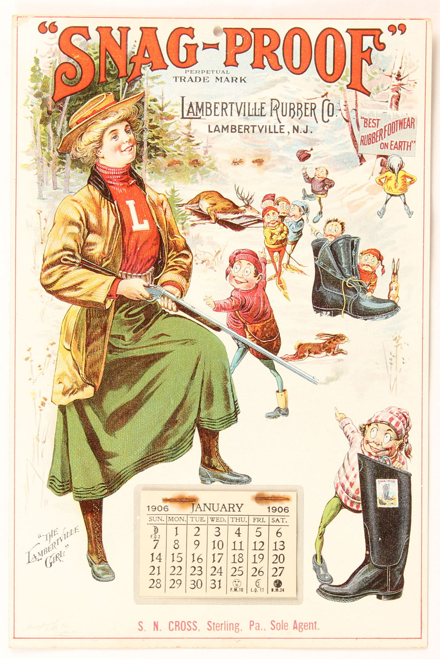 1906 Johnson & Hunter ''SNAG-PROOF'' rubber boots, pictures lady in dress with single shot gun in snow scene with deer & rabbit, has fantastic colors, framed, 8 1/2'' x 12 1/2''. Grade: Excellent ++ - Value: 100 to 600