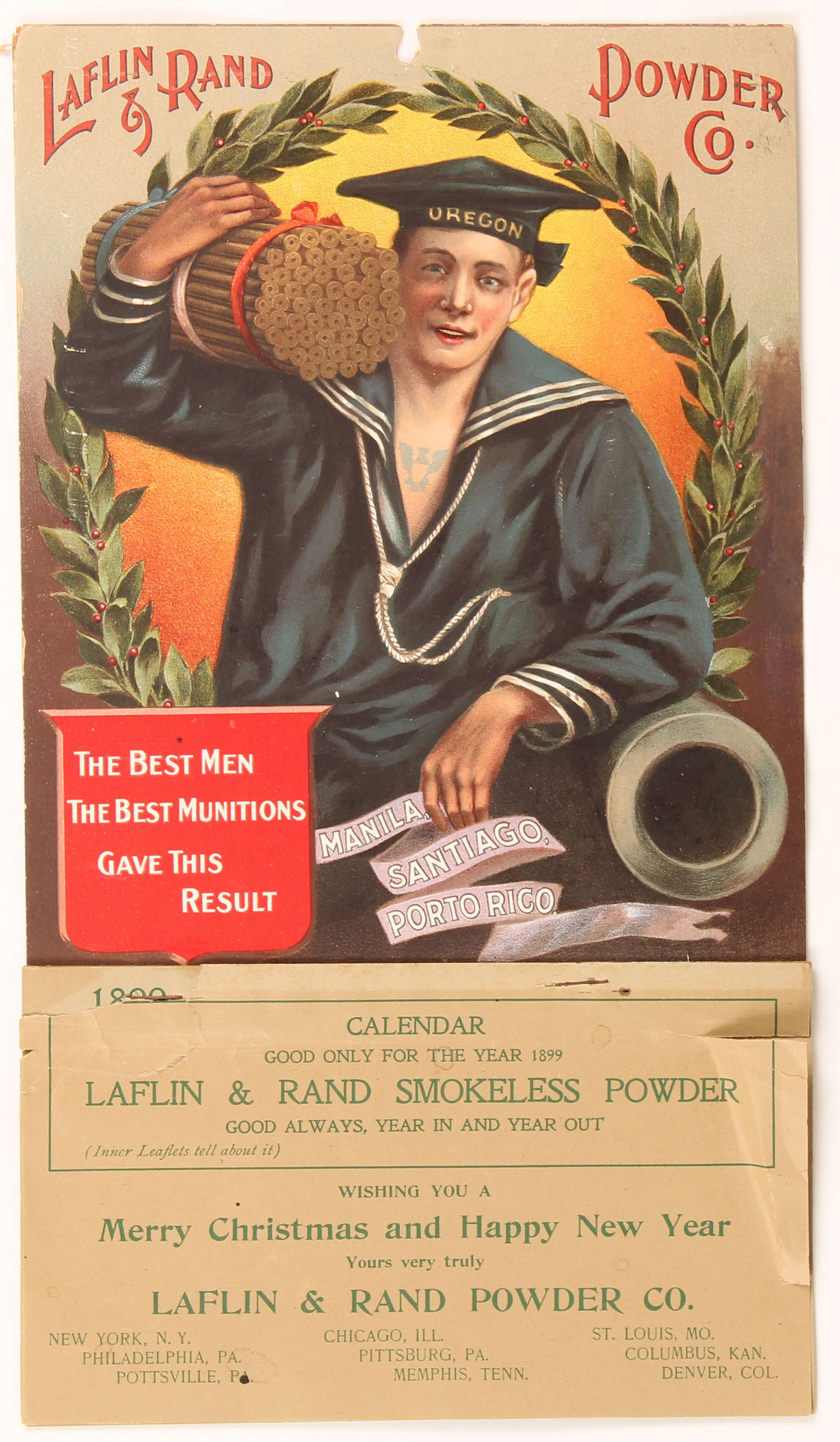RARE 1899 Laflin & Rand Powder Co, pictures sailor with OREGON on his hat, from the USS OREGON battleship, full pad of pages with cover sheet, has great colors, 8'' x 14''. Grade: Excellent - Value: 400 to 2000