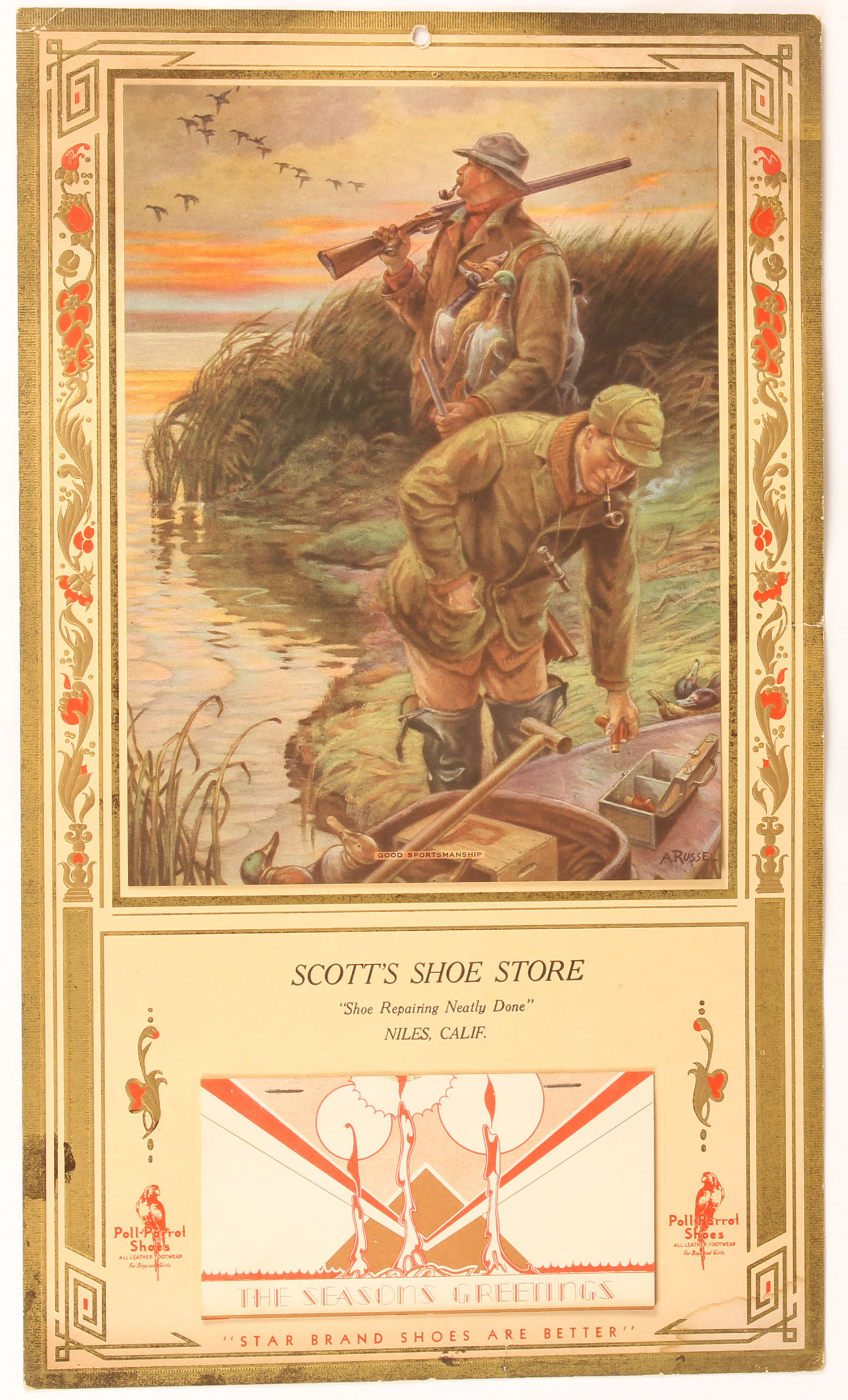 1937 Calendar GOOD SPORTSMANSHIP, pictures two duck hunters returning with many dusk with many still flying, by A. Russel, 10'' x 17'', full pad of pages. Grade: Excellent - Value: 20 to 100