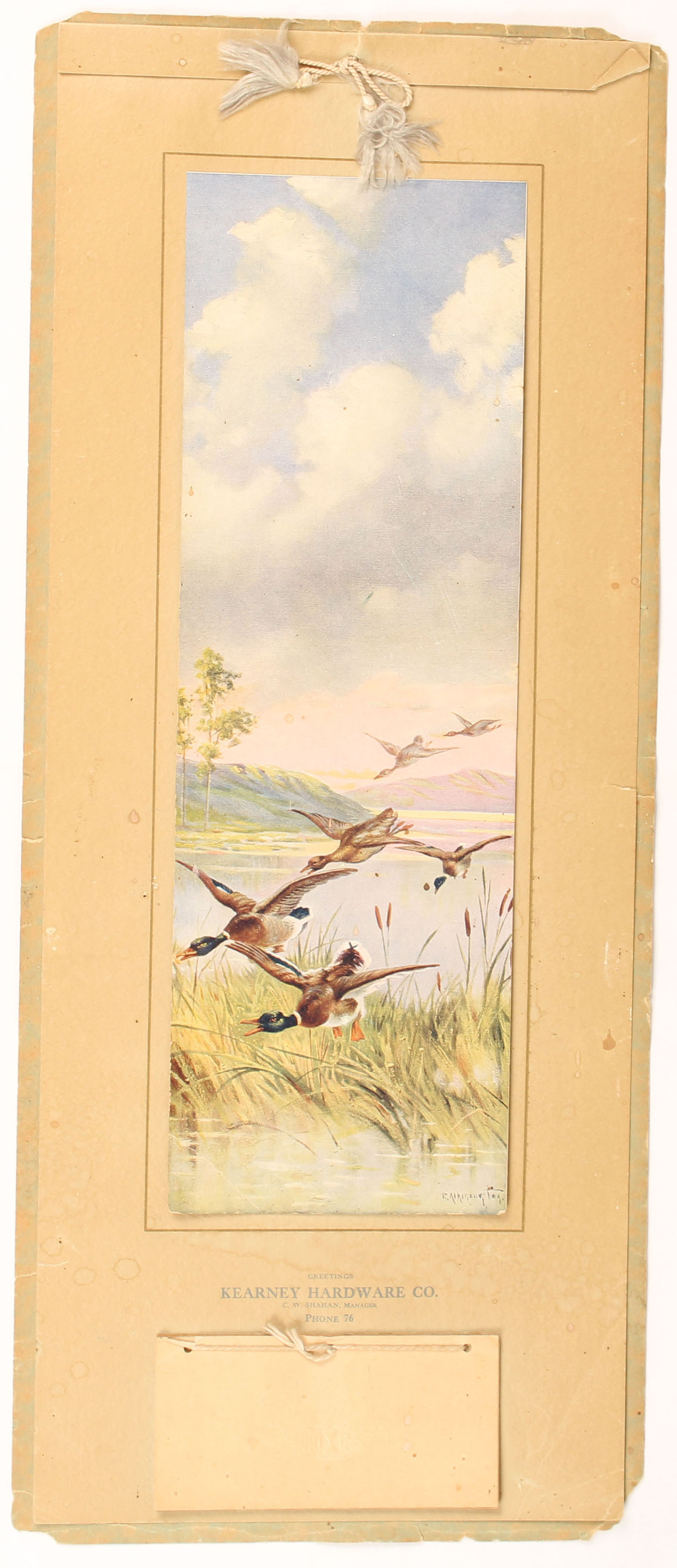 1919 Calendar by R. Alkinson Fox, pictures mallards flying at you over marsh grass, 9'' x 22''. Grade: Very Good ++ - Value: 10 to 100