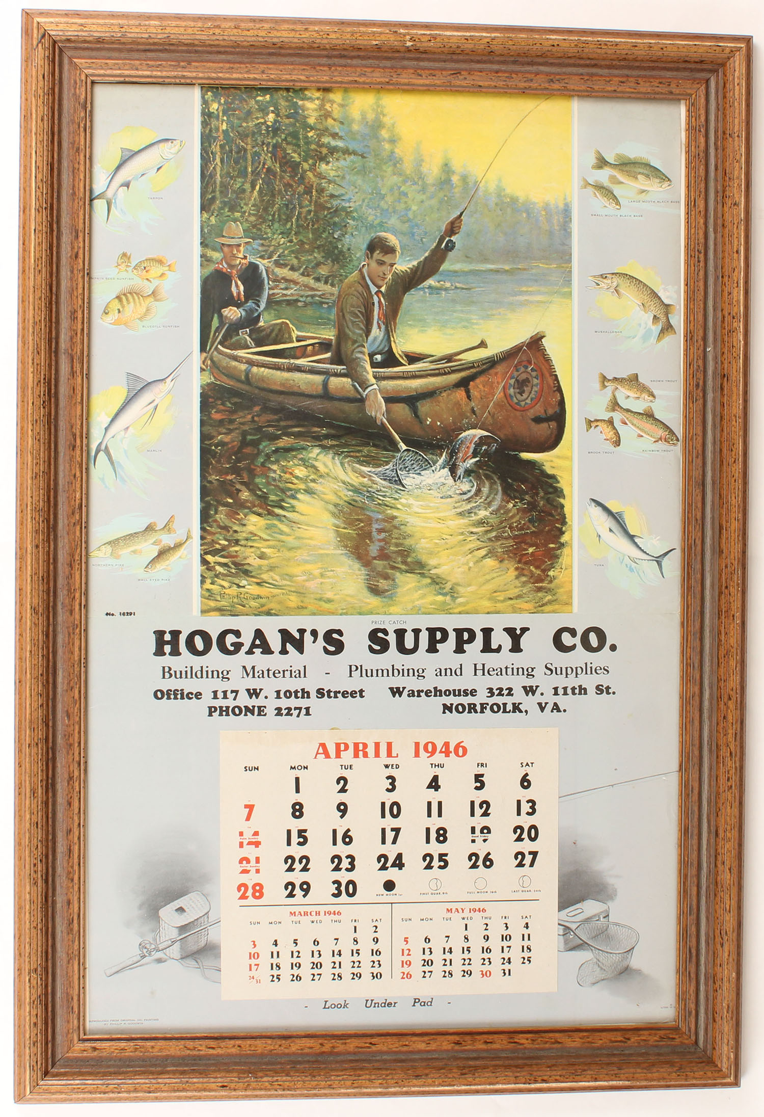 1946 Philip R Goodwin calendar, PRIZE CATCH, pictures two fisherman in birch canoe lading a large brook rout, has many photos on each side, framed size 22'' x 32''. Grade: Excellent - Value: 100 to 500