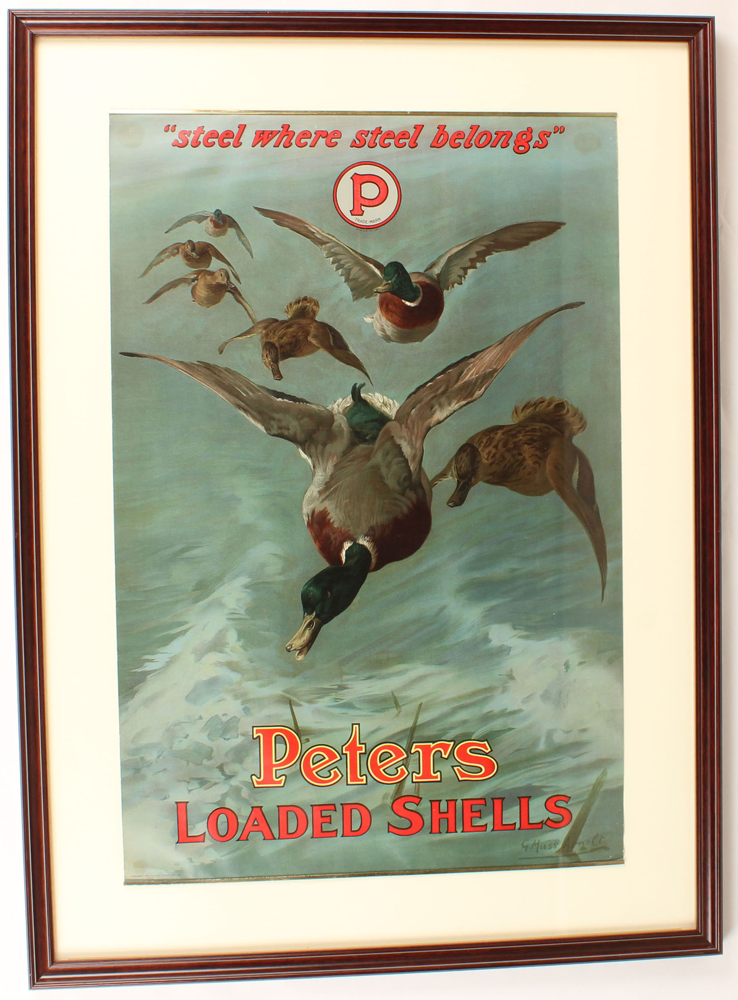 Peters Cart. Co. Poster, ''STEEL WHERE STEEL BELONGS'' ''PETERS LOADED SHELLS'', Artist G. Muss Arnolt, bands top & bottom, 193/4'' x 30'', wonderful image of mallards flying right at you, has bright vivid colors with no edge wear or roll wrinkles, framed, EXTREMELY RARE! Grade: Excellent - Value: 2000 to 5000