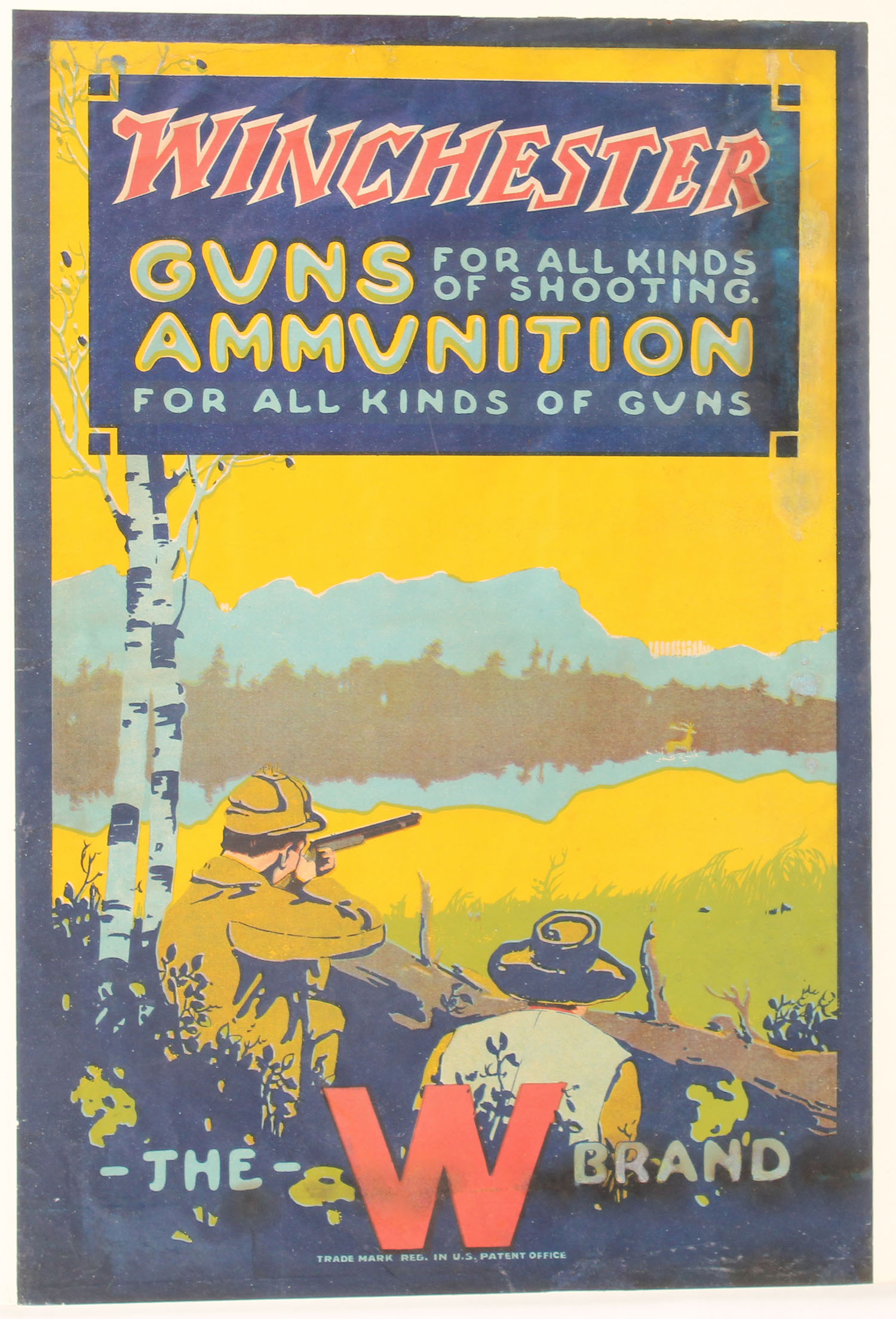 Winchester Poster ''Winchester Guns for all kinds of shooting. Ammunition for all kinds of guns, THE W BRAND'', fall colors of two hunters shooting at elk, 12'' x 18'', has some restoration. Grade: Very Good ++ - Value: 300 to 900