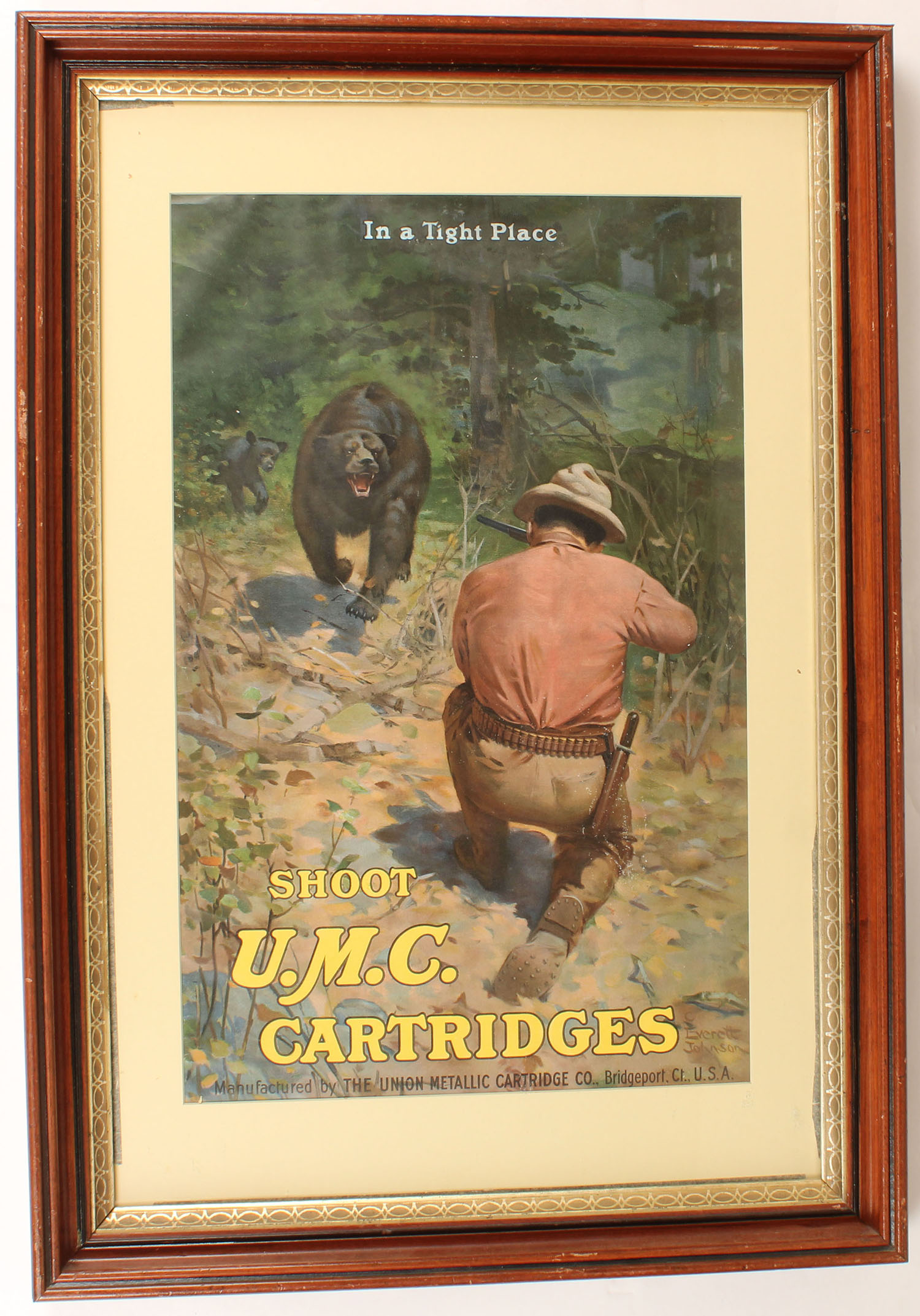 U.M.C. Ammunition Poster, ''IN A TIGHT PLACE'', pictures Black Bear on attack with hunter shooting off a knee by C.E. Johnson, has metal bands top & bottom, 16 1/4'' x 25 1/4'', framed & matted, 100% original condition, near mint with fantastic colors. Grade: Excellent ++ - Value: 1000 to 4000