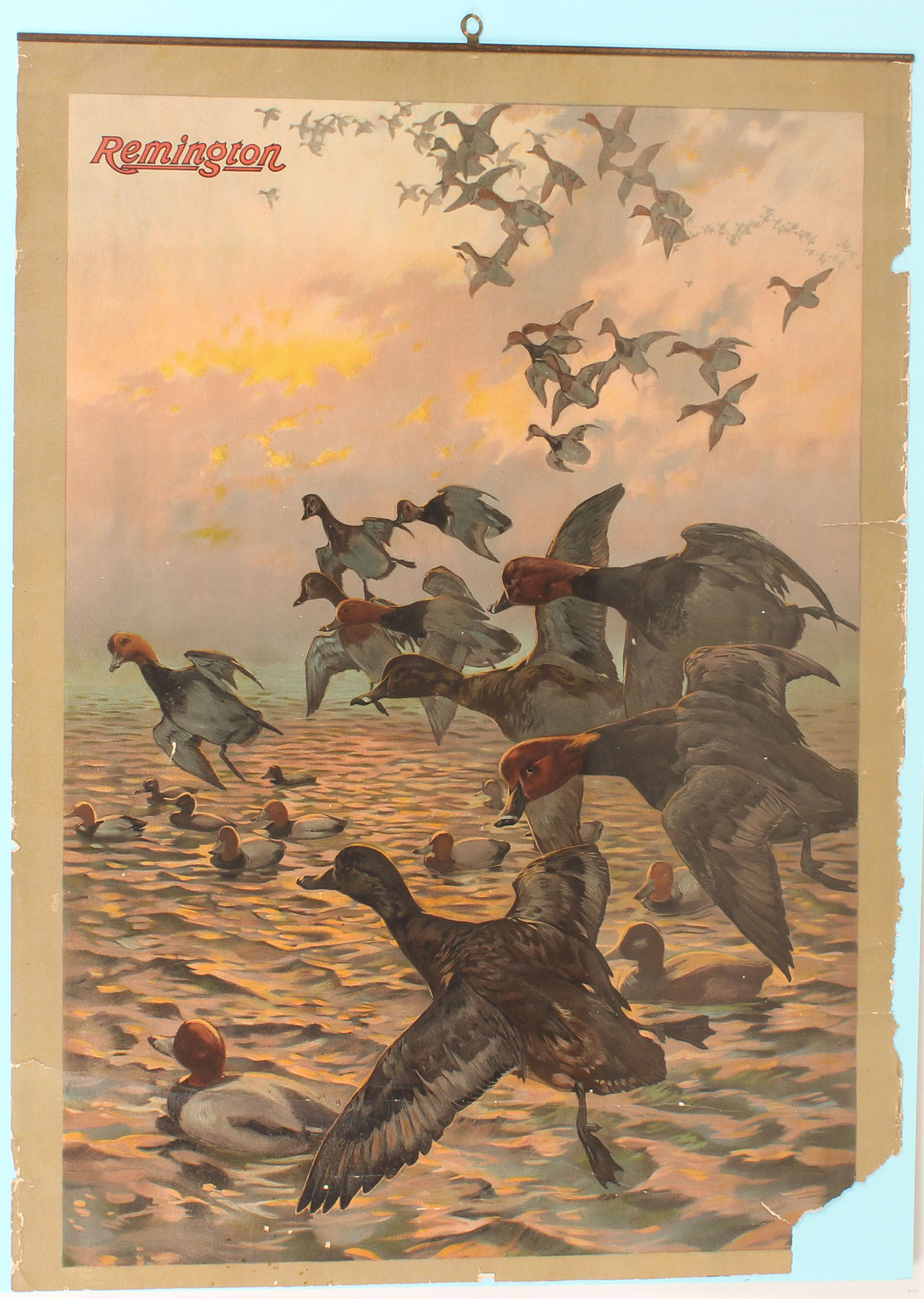 VERY RARE Remington REDHEADS poster, circa 1908, has grand image of redheads in flight over decoys, 18 3/4'' x 26'', shows edge wear & missing about 3'' off the bottom, has metal band on top with brass hanger, VERY RARE! Grade: Very Good + - Value: 500 to 2000