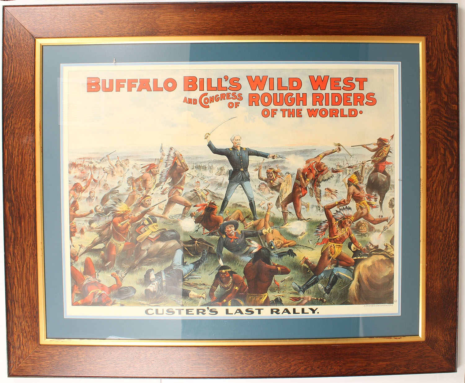 Very Rare Buffalo Bills Wild West and Congress of Rough Riders of the World Poster, depicting Custers Last Rally, outstanding color and graphics, 28 1/2 x 38 1/4'', framed. Grade: Excellent + - Value: 500 to 3000