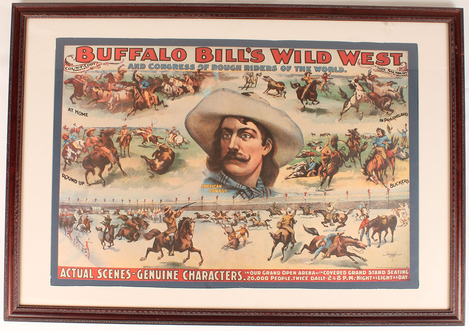 BUFFALO BILL'S WILD WEST Poster, 100% all original, wonderful full color images of the show with a large center piece on Buffalo Bill in center, 31 1/4'' x 20 3/4'' image size, framed & matted, marked curtesy of Circus World Museum. Grade: Excellent - Value: 200 to 1000