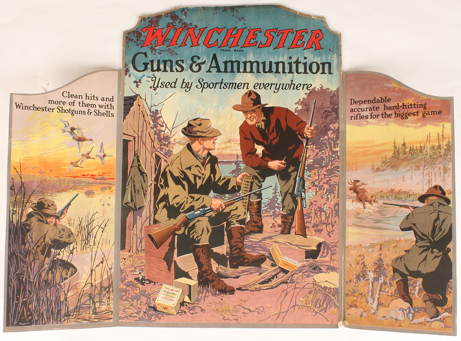 Winchester Diecut POP, pictures two hunters at campsite with 2pc Repeater shotshell box, left side pictures duck hunting scene, right side is a moose hunting scene, 40 1/4'' x 30 1/8'', Very Hard to find and this one is complete, light edge wear with fantastic colors. Grade: Excellent + - Value: 2000 to 5000