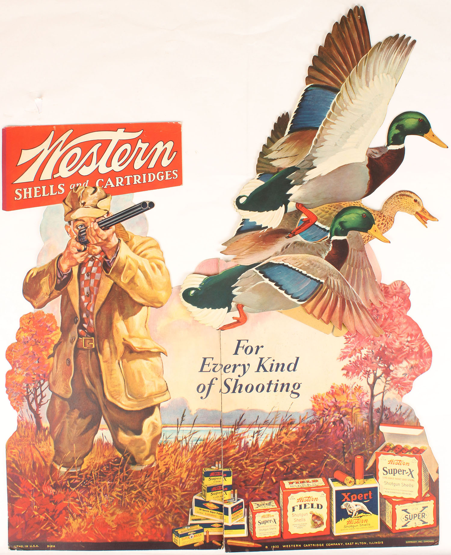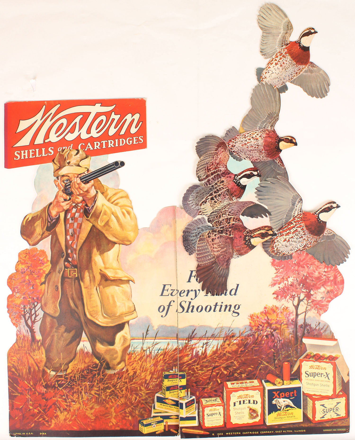 Rare Western Diecut with options, pictures a hunter shooting a double shot gun at a covey of quail in flight or Mallard in flight & dog on point at bottom center by Lynn Bogue Hunt, dog has its own easel back, fantastic full colors, all corners & edges are near mint, 37'' x 36 on main piece, the two bird diecuts add some height to it & measure 18'' x 30'', the only flaw would be the two main pieces are not connected at this point. What a fantastic diecut. Grade: Excellent ++ - Value: 2000 to 4000