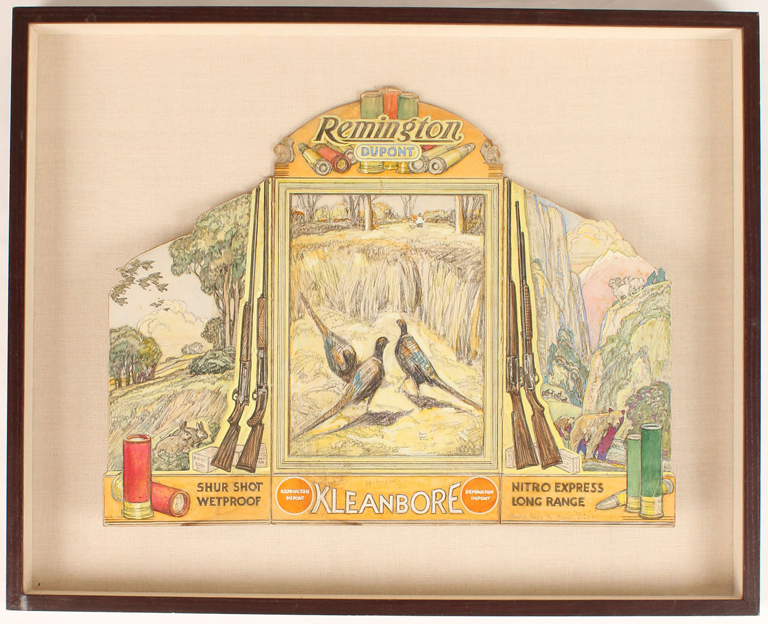 Handmade rendering of a Remington UMC diecut, 3 panels, pictures pheasants in the center, rabbits on the left & bear on the right, framed in shadow box, the art work is a little rough, 20 1/4'' x 16''. Grade: Excellent - Value: 10 to 500