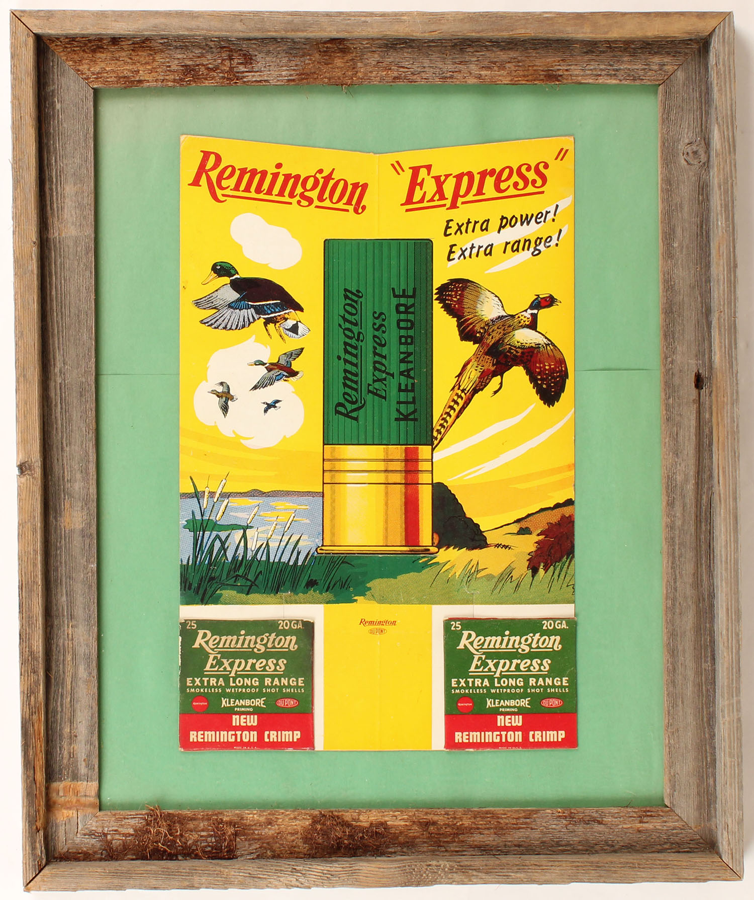 Remington Diecut, ''REMINGTON EXPRESS EXTRA POWER EXTRA RANGE'', pictures large shotshell, mallards & pheasants, framed, 10 1/2'' x 16''. Grade: Excellent + - Value: 80 to 250