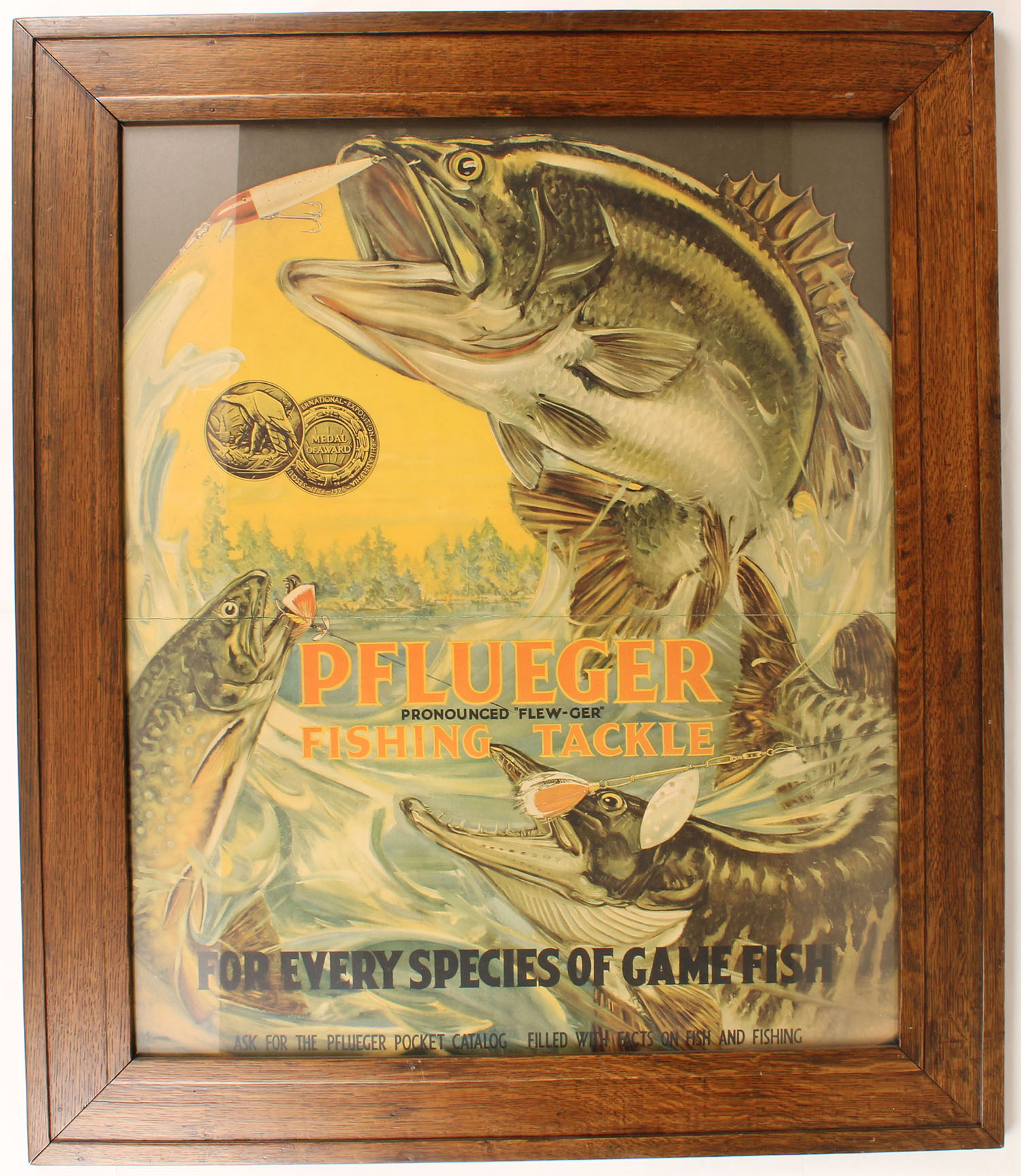 Pflueger FISHING TACKLE ''Pronounced FLEW-GER'' Diecut, has great full color image of many different fish on the hook & lures, 29'' x 33'', has a fold mark at center otherwise on edge wear, Rare & Hard to find! Grade: Excellent - Value: 1000 to 3000