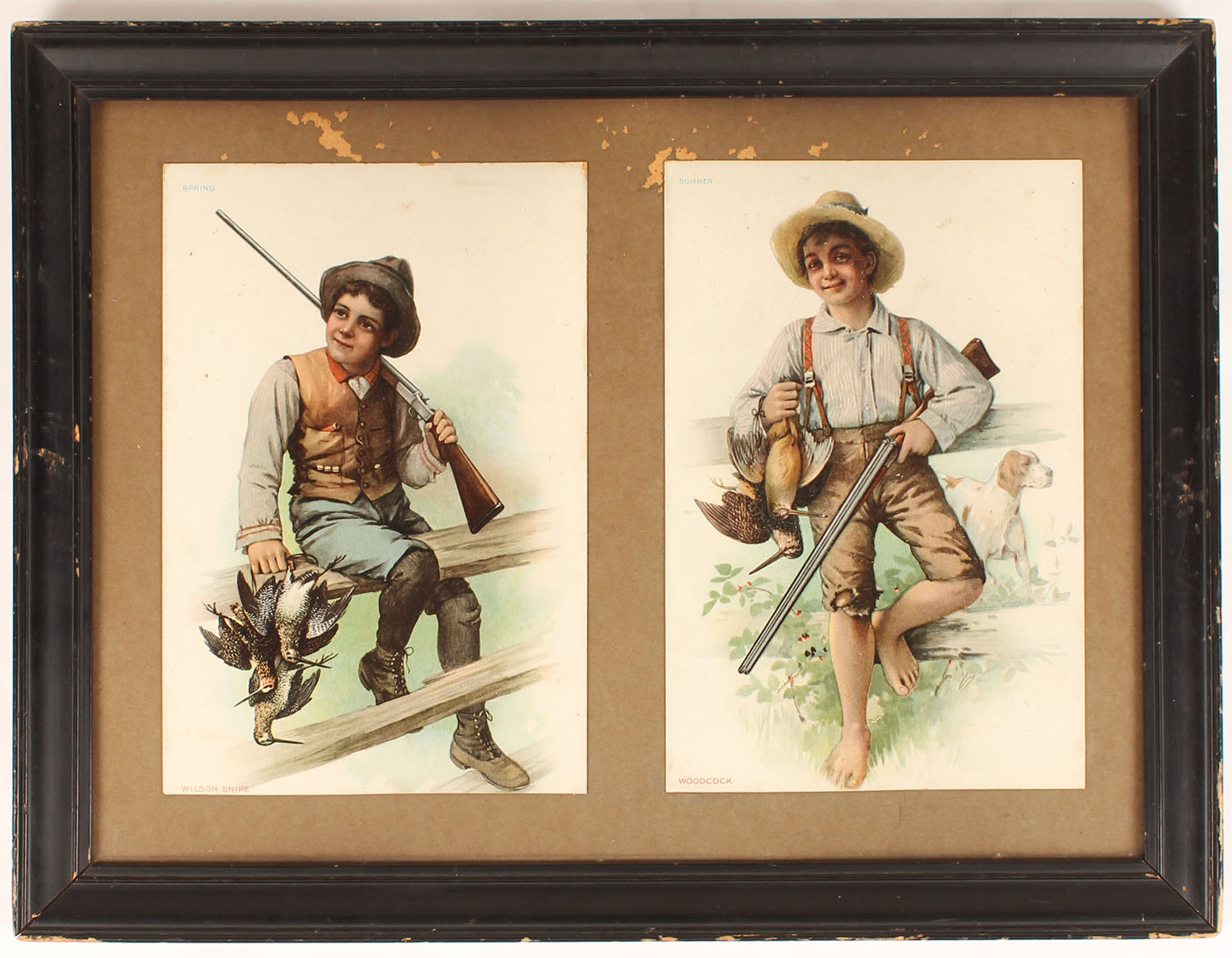 Lot of 2 Laflin & Rand Diecuts, pictures young boys with shotguns & birds, marked Spring ''Wilson Snipe'' or Summer ''Woodcock'', framed, each on is 8'' x 12''. Grade: Excellent - Value: 100 to 500