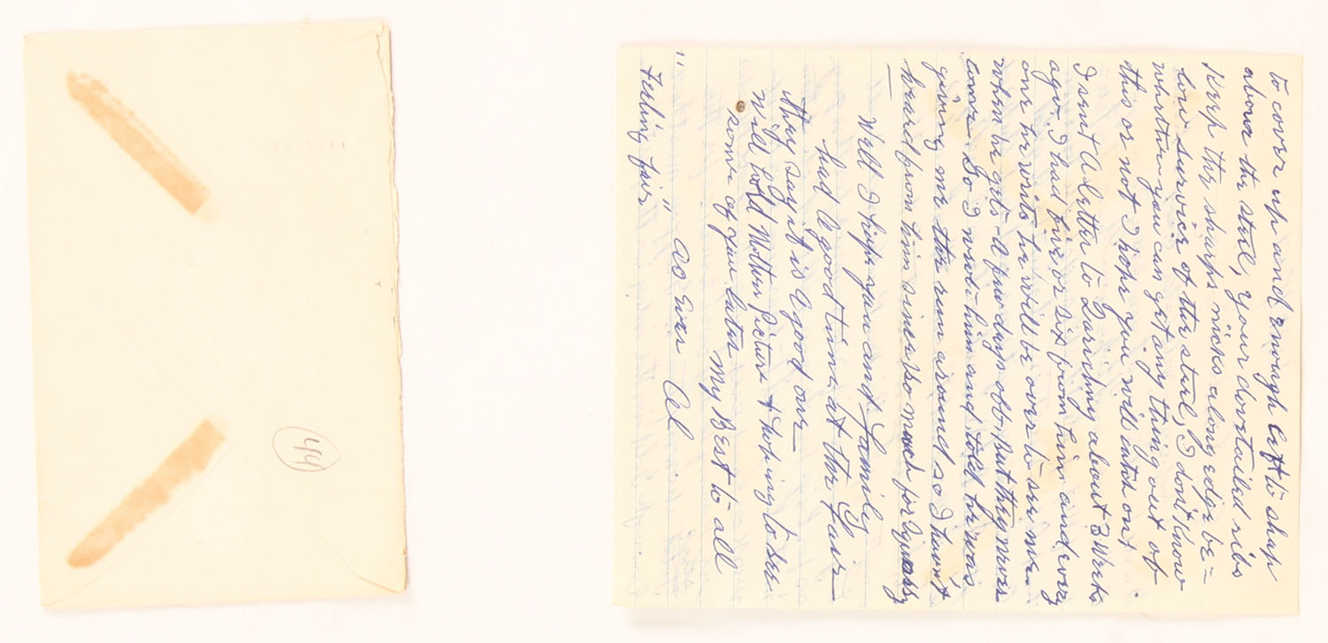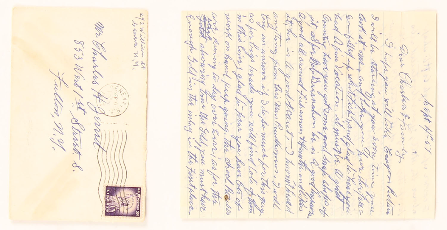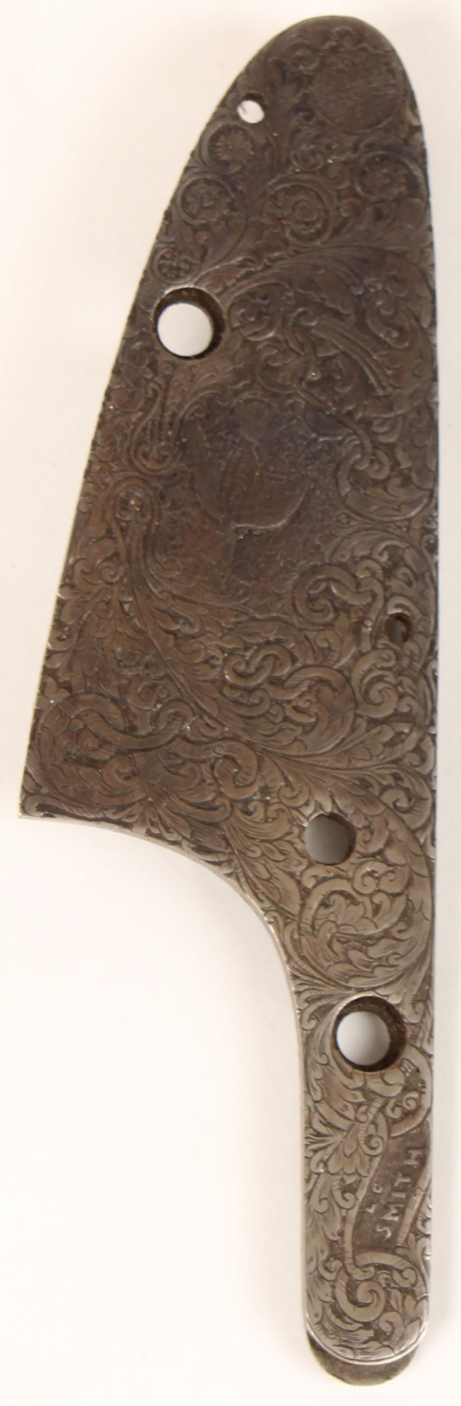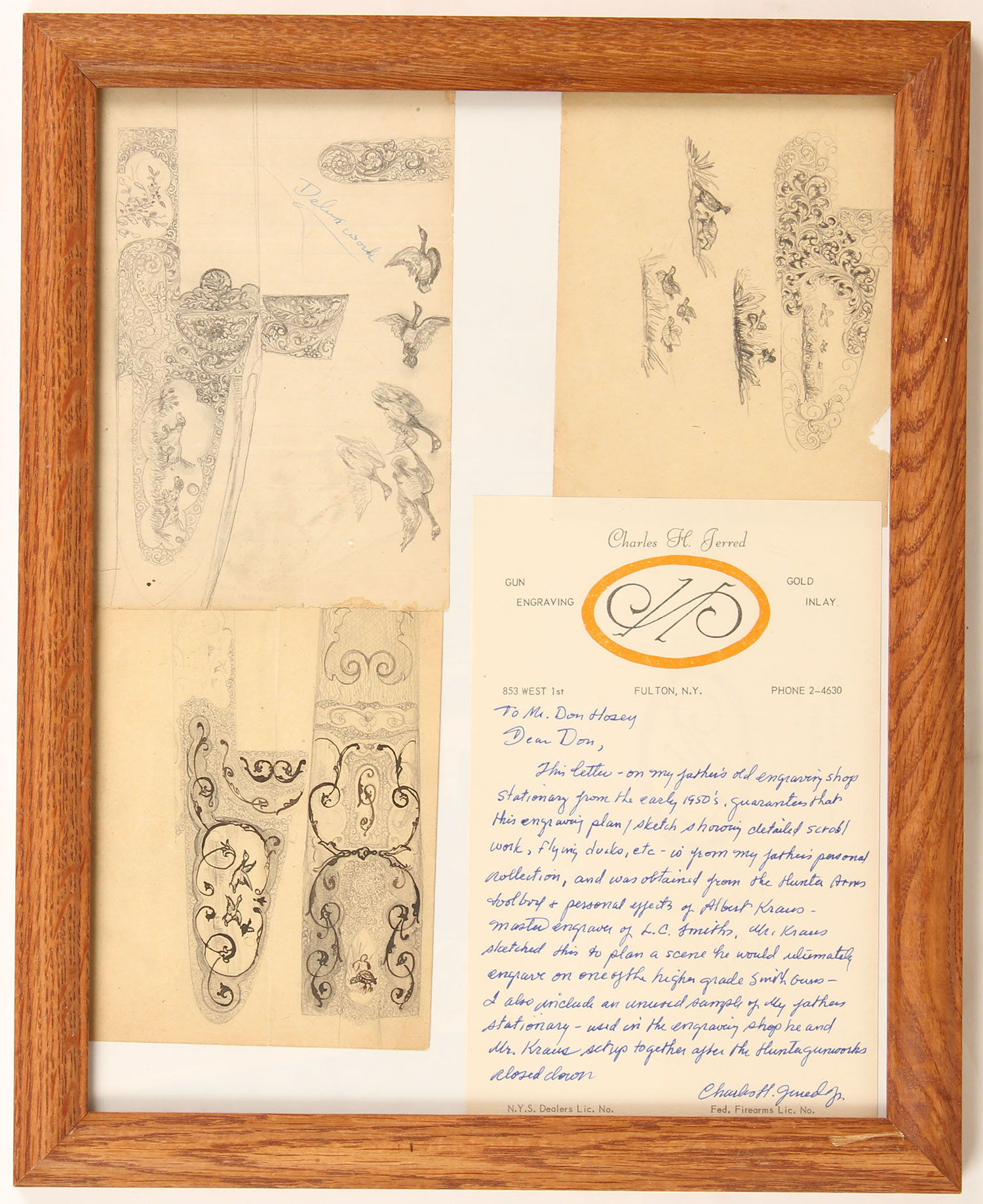 RARE Hunter Arms & L.C. Smith Memorabilia, Here we have items from the personal collection of Mr. Albert Kraus Master engraver at the former Hunter Arms in Fulton, N.Y. from the late 1800's until c 1950, We have a documented letter stating that all of the following items were in the from Mr. Kraus personal items he used to engrave guns & draw, the list includes: his delicate engraving hammer with bulbous counterweight handle and tiny head stamped ''England'', Mr. Kruse used this hammer to engrave L.C. Smith shotguns for many years at Hunter, Item (2) is a small shield shaped watch FOB, appears to be made of silver and was also found in Mr. Kraus' tool chest from hunter, the FOB is delicately engraved with a Woodcock which was engraved by Mr. Kraus for his own use, we has three pencil sketches found in the personal engraving toolbox of Albert Kraus that are proposed engraving layouts for two Smith guns (1) shows detailed scroll and florals, and various geese. Its is about 5'' x 7'', shows pointers in the field and is marked ''Deluxe work'' and ''L.C. Smith''; and (2) about 4 1/2'' x 6'' shows detailed scrollwork and 3 partridges in flight and includes 3 alternative sketches of partridges flying, feeding and being flushed out. Plus engraving tools: other than the hammer, (2) a fine hand graver marked ''Sandoz'', and (3) another hand graver called a double line graver - with double points, (4) B&W photo of Smith Gunworks, (5) three letterheads & envelopes (two of witch have handwriting, (6) a colored self portrait of Mr. Kraus, (7) notarized two page letter authenticating all of this belonged to Mr. Kraus. See lot 8273 for some hand written letters by Mr. Krause, Very Rare opportunity to own a piece of gun making history! Grade: Excellent - Value: 500 to 2000
