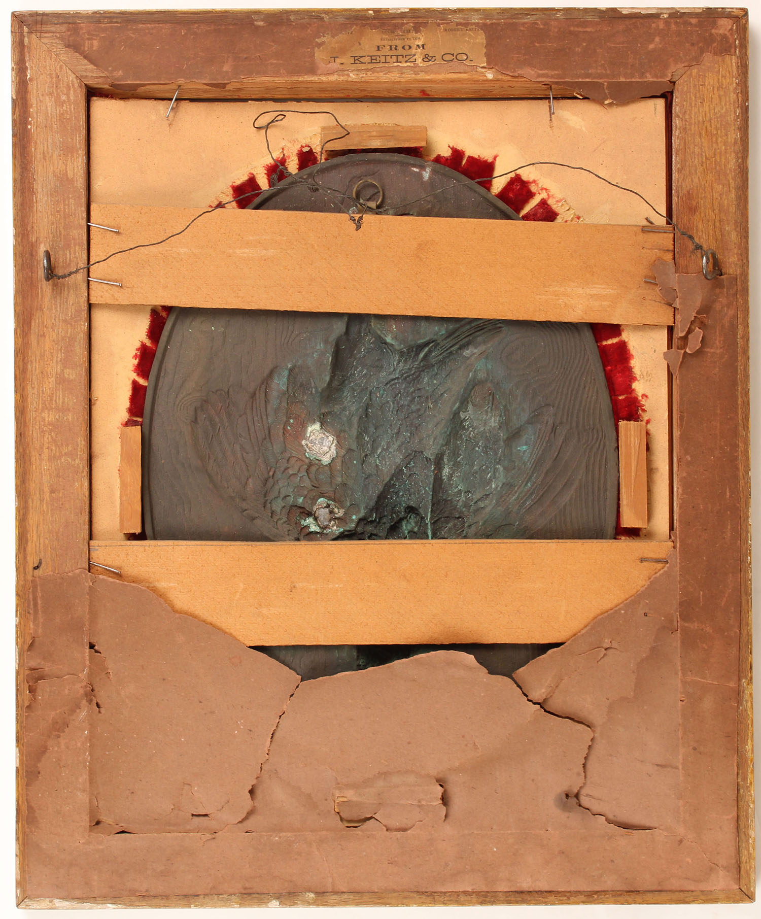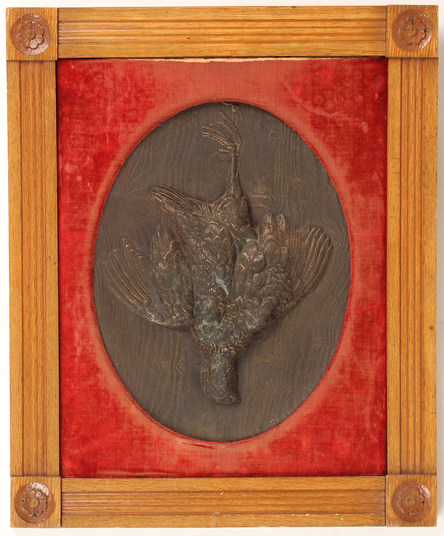 Alexander Pope Jr 3D Tin of quail hanging, wonderful fine detail of each feather, oval is 10'' x 13'', framed with wood & red cloth. Same artist that did the Winchester Green Door, Very Rare & Hard to find! Grade: Excellent - Value: 1000 to 4000